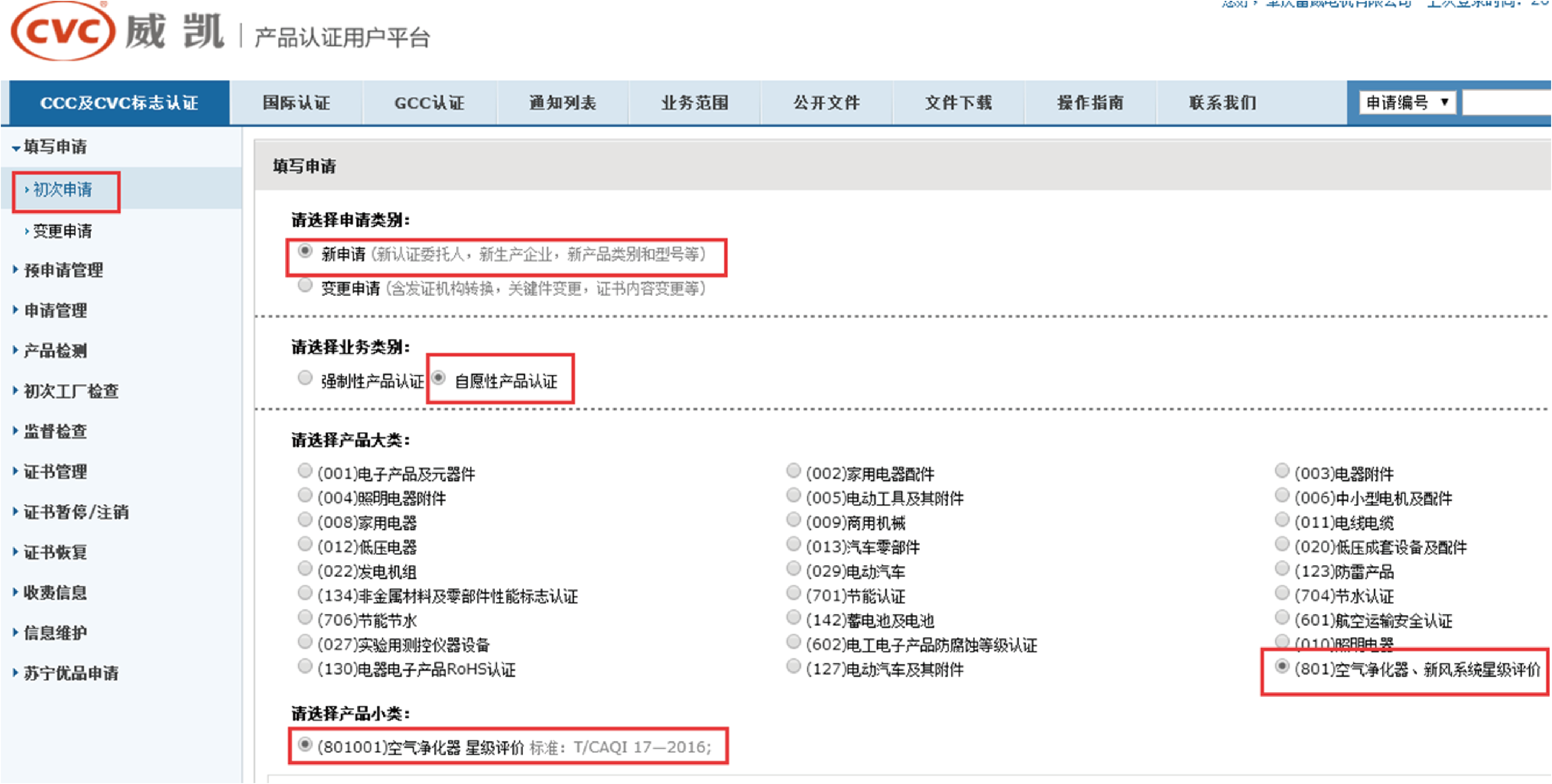 1、提交申请。登录威凯认证系统:http://ccc.cvc.org.cn/Login.aspx,注册账号,如下图进行类别选择,并填写企业、产品信息后,提交申请。