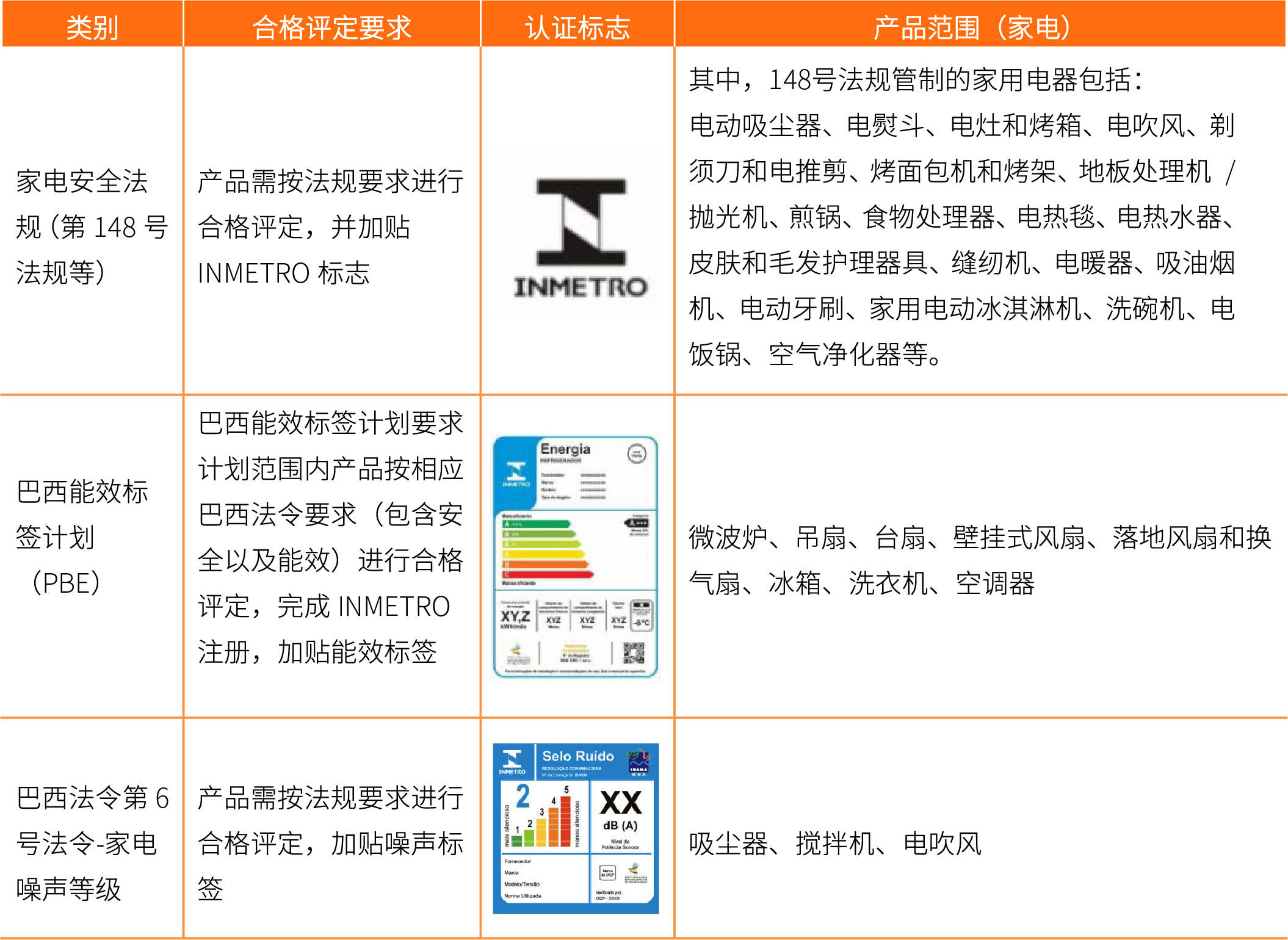 出口巴西的产品应按照相应法规要求进行合格评定,以家电产品为例,主要包括: