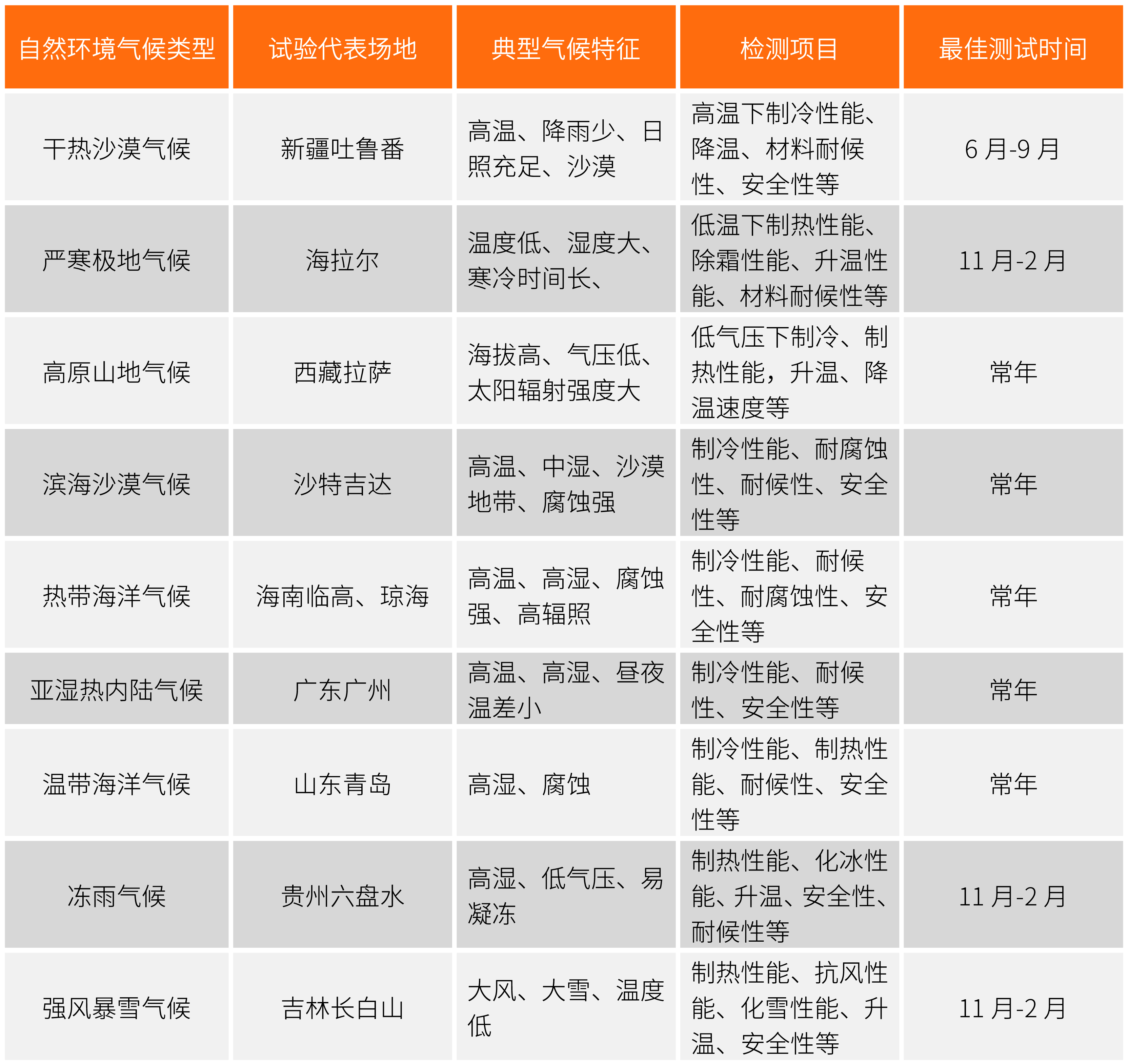 中国电研威凯公司拥有干热沙漠、严寒极地、热带海洋、强风暴雪、冻雨等覆盖中国不同气候带的多个严酷自然气候环境试验场,可开展电子电器产品耐候性、安全、性能、可靠性等测试。